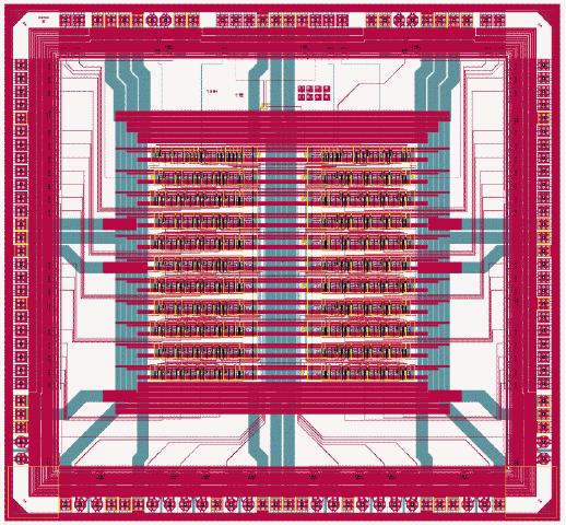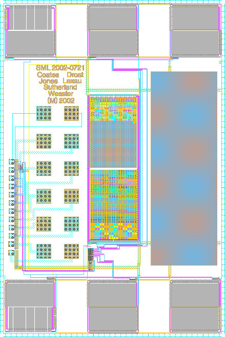 A test chip to measure on-chip and inter-chip capacitance structures. Designed by the Asynchronous Design Group of Sun Microsystems. The Electric libraries for this chip can be downloaded here.