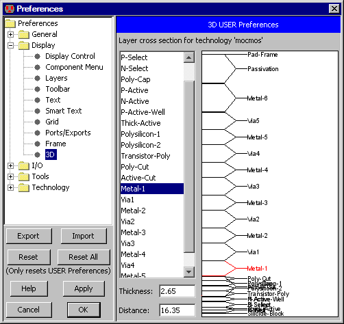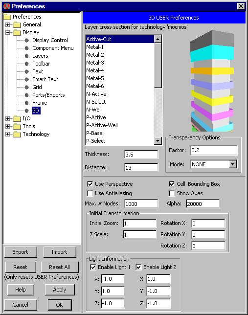 | If Java3D is not installed, the distance and the thickness can still be controlled. In such a situation, the 3D Preferences dialog has much more limited information. The cross-section information on the right shows layers and their range of depth. You can choose either the layer name or its cross-section name. | ![]() |