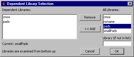 To connect a sequence of libraries, a list is placed in the bottommost library pointing to the earlier, or dependent libraries. In the example below, the current library is "smallPads" and it is tailored with two other libraries: "pads" and "cmos" (the base library). Note that the list implicitly begins with the current library, and continues in reverse order. In this example, the first library examined is "padsSmall", followed by "pads" and finally the base library "cmos".